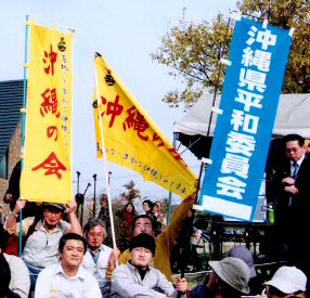 それ以来座間市では移転は基地機能の強化と恒久化につながるものとして市、市議会、市自治会連絡協議会が市民と一体となって座間市連絡協議会を設立し反対運動を進め、10数回にわたる外務大臣や防衛庁長官への移転反対の要請や、市長自ら街頭に立ち人口の約半数の6万もの署名を集め、国へ提出し「重く受け取る」との返答を得、アメリカ合衆国の国防長官、国務長官にも書簡で伝えるなど、さまざまな活動をしてきた。 市ではこれまでに繰り返し報道された内容に対し何度も国に事実確認をしたが、その度に「報道のような事実はない」との返答に終始され、事前には「地元の意思を尊重し、日米再編協議にあたる」と明言していた。にもかかわらず地元無視の頭越しの交渉を進め、10月29日に発表された中間報告では米陸軍第一軍団司令部のキャンプ座間への移転が盛り込まれた。 さらに昭和46年自衛隊移駐時に国と市で締結した覚書において、第1条「施設部隊(約300名)の一部使用」、第2条「基地縮小に最大限努力する」と確認書も取り交わしている。このことからして座間市では基地の整理・縮小・返還に逆行し、不誠実、不透明な国の姿勢に大きな不信感を抱き自治体・市民が一体となって怒りをあらわにしている。 そんな中私達沖縄の会のメンバーは会場の谷戸山公園へ向かった。会場は全国から集まった11.000人の参加者で埋め尽くされ熱気であふれていた。沖縄平和委員会の旗が見え11人の参加者がいたので一緒に行動することにし、いろいろ辺野古のことなど情報交換も出来た。 さて、今回の米軍再編の中でキャンプ座間の基地強化計画は沖縄の基地強化計画と並んで最大の要とも言われ、目玉とも言われている。その「米陸軍第一軍団司令部とはいったい何者なのか」そして「米軍再編とは何なのか」探ってみた。来賓の挨拶、報告の中で日本共産党の志位委員長は2つの柱があり、3つの告発をしている。 1つめの柱は在日米軍をイラク戦争のように先制攻撃ができ、世界中何処へでも迅速に展開ができる機動的な軍隊にすること。2つめは同盟国と軍事的な協力体制を作り上げることと指摘している。